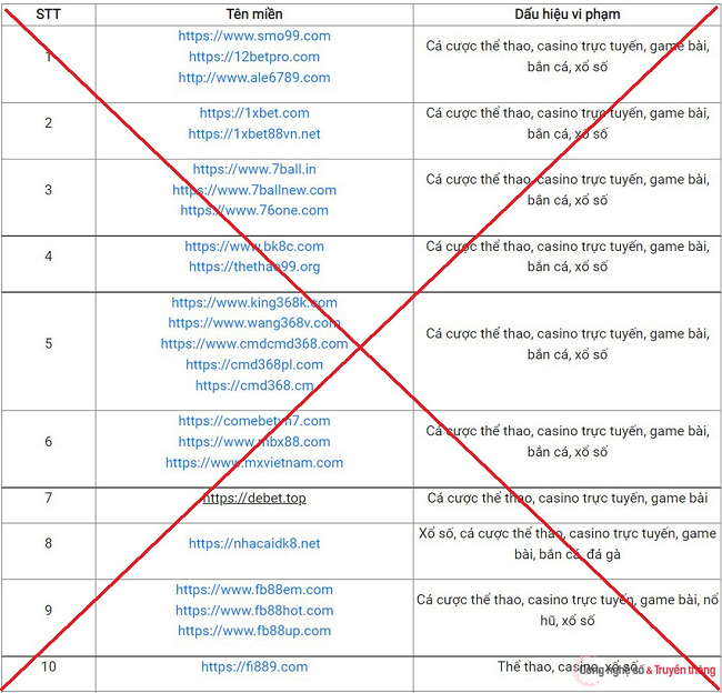 Các dấu hiệu vi phạm của những website được Bộ TTTT công bố lần này tập trung vào cá cược thể thao, casino trực tuyến, game bài, xổ số, đá gà, bắn cá, đua ngựa, lô đề…