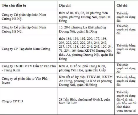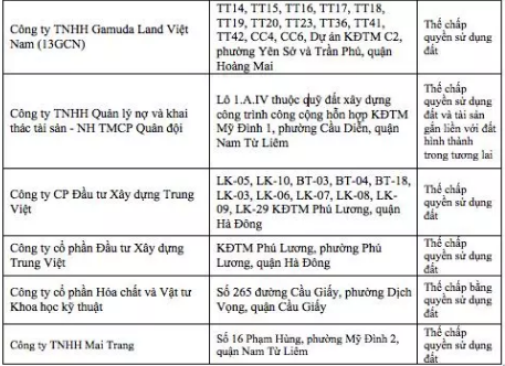 Ngoài ra, còn kể đến các “đại gia” bất động sản khác: Công ty Cổ phần tập đoàn Nam Cường Hà Nội (thửa số 04, 03, 02, 01 phường Yên Nghĩa, phường Dương Nội, quận Hà Đông) thế chấp quyền sử dụng đất. Công ty cổ phần Xuất nhập khẩu Tổng hợp Hà Nội (D20-CTDDCN1, KĐTM hai bên đường Lê Trọng Tấn, phường Dương Nội, quận Hà Đông và xã La Phù, huyện Hoài Đức) thế chấp quyền sử dụng đất. Công ty TNHH Mai Trang (Dự án số 16 Phạm Hùng, phường Mỹ Đình 2, quận Nam Từ Liêm) thế chấp quyền sử dụng đất. Công ty cổ phần Hóa chất và Vật tư Khoa học kỹ thuật (Dự án Số 265 đường Cầu Giấy, phường Dịch Vọng, quận Cầu Giấy) thế chấp bằng quyền sử dụng đất…