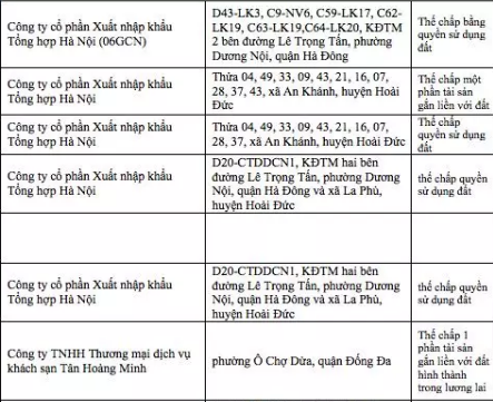 Cụ thể, Công ty TNHH Thương mại dịch vụ khách sạn Tân Hoàng Minh thế chấp 1 phần tài sản gắn liền với đất hình thành trong lương lai dự án tại phường Ô Chợ Dừa, quận Đống Đa. Công ty TNHH Đầu tư Capitaland - Hoàng Thành (CT09 - Khu Cổ Ngựa, Khu đô thị mới Mỗ Lao, phường Mộ Lao, quận Hà Đông) thế chấp bằng quyền sử dụng đất. Công ty cổ phần Đầu tư Xây dựng Trung Việt (KĐTM Phú Lương, phường Phú Lương, quận Hà Đông) thế chấp quyền sử dụng đất…