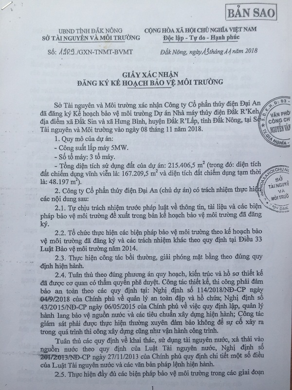 Thực hiện chỉ đạo của UBND tỉnh, ngày 20/6/2019, Sở Tài nguyên Môi trường tỉnh ĐăK Nông tổ chức cuộc họp, có đại diện các đơn vị có liên quan, nghe đại diện Công ty Đại An trình bày các phương án để duy trì nguồn nước và cảnh quan thác 5 tầng. Tại cuộc họp, đại diện các Sở, ngành, địa phương đánh giá cao việc xây dựng các phương án để duy trì nguồn nước và cảnh quan thác 5 tầng của Công ty Đại An và ủng hộ việc đầu tư thủy điện, kết hợp phát triển du lịch theo báo cáo của nhà đầu tư. Căn cứ ý kiến của các sở ngành, Sở Tài nguyên và Môi trường có văn bản báo cáo UBND tỉnh các nội dung liên quan, để xem xét, quyết định.