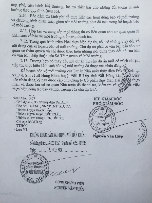 - Toàn bộ diện tích phía bờ phải (xã Hưng Bình) của thác 5 tầng đã được Công ty thỏa thuận mua lại của các hộ dân nên thuận tiện cho công tác đầu tư xây dựng kết hợp giữa thủy điện và du lịch. Khi UBND tỉnh Đăk Nông cho phép đầu tư, Công ty sẽ làm việc với các hộ dân bên bờ trái (xã Đăk Sin) của thác 5 tầng, để thỏa thuận mua đất thực hiện dự án hoặc cùng kết hợp đầu tư.