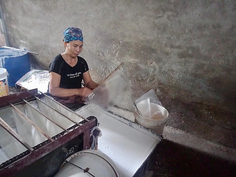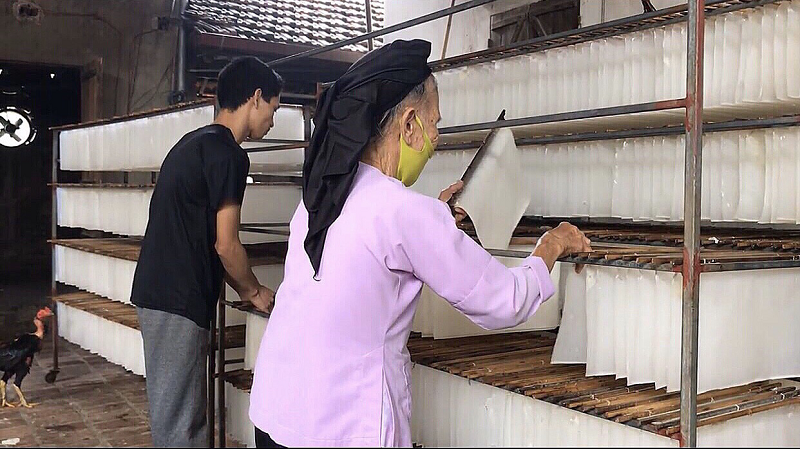 Bánh được tráng bột bằng những tấm phim nhựa và phơi khô, sau khi đưa vào dây truyền hấp chín bởi những người khuyết tật.