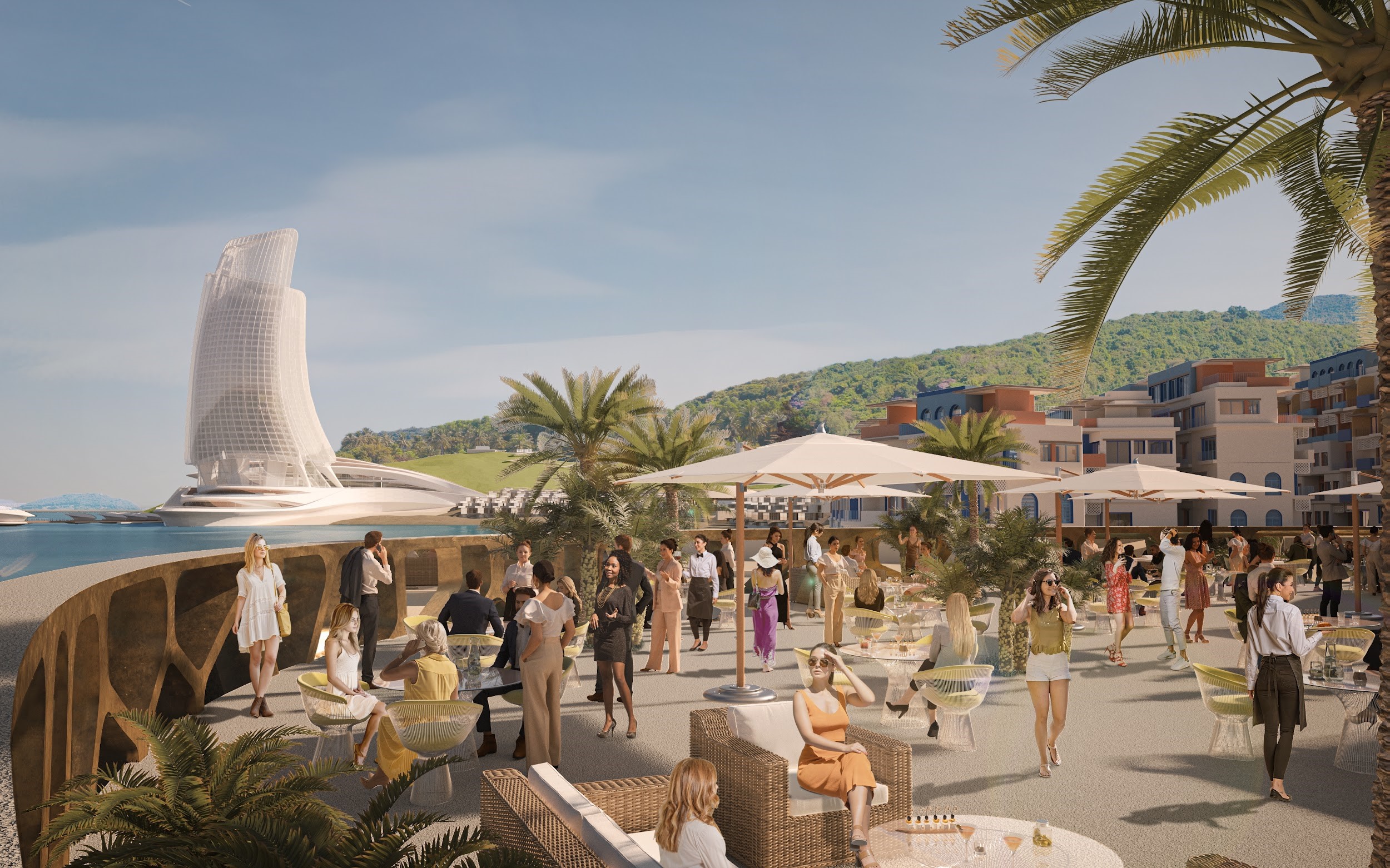 Ra mắt đầu tiên, hợp phần Sun Iconic Hub gây ấn tượng với những tuyệt phẩm kiến trúc trên địa hình đồi núi dốc thoải dần xuống biển Bãi Trào. Tại mũi đất với những ghềnh đá vươn ra biển, Sun Group cùng đội ngũ KTS tài ba của 10 Design phác họa công trình Tòa nhà Cánh Buồm độc đáo, mô phỏng hình ảnh cánh buồm no gió căng tràn sức sống. Tại đây sẽ có hệ thống phòng khách sạn cao cấp cùng vô số tiện ích hạng sang, như sky club, cầu cảng ngắm hoàng hôn, bể bơi vô cực, trung tâm giải trí, nhà biểu diễn nghệ thuật…