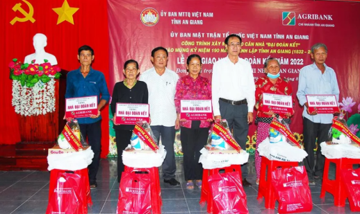 Giám đốc Agribank An Giang Bùi Thanh Quang trao quà cho người nghèo. Ảnh Trọng Triết