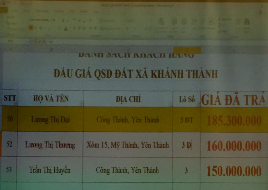Tại xã Khánh Thành, lô đất số 03 (vùng quy hoạch Đồng Tường), năm 2016 đã 2 lần đưa ra đấu giá trực tiếp nhưng không ai đăng ký mua vì lô đất nằm ở chính diện ngã 3 đường, giá khởi điểm ngang với 3 lô đất liền kề. Theo quan niệm của người địa phương thì những lô đất ở vị trí ngã 3, phong thủy không đẹp, người mua thường không gặp may mắn. Vì vậy, đầu năm 2019 UBND xã Khánh Thành có tờ trình gửi UBND huyện Yên Thành xin đã hạ mức giá khởi điểm thửa đất trên từ 160 triệu đồng (năm 2016) xuống 80 triệu đồng. Sau khi hạ mức giá khởi điểm, có 9 người tham gia đấu giá lô đất. Bà Đ, bà Th và bà H cũng nộp hồ sơ tham gia đấu giá lô đất này. Khi công bố giá đấu, cả 3 người phụ nữ trên đã trả giá cao hơn rất nhiều so với 6 người dân địa phương. Bà Đ đã trúng đấu giá lô đất trên với số tiền 185,3 triệu đồng.