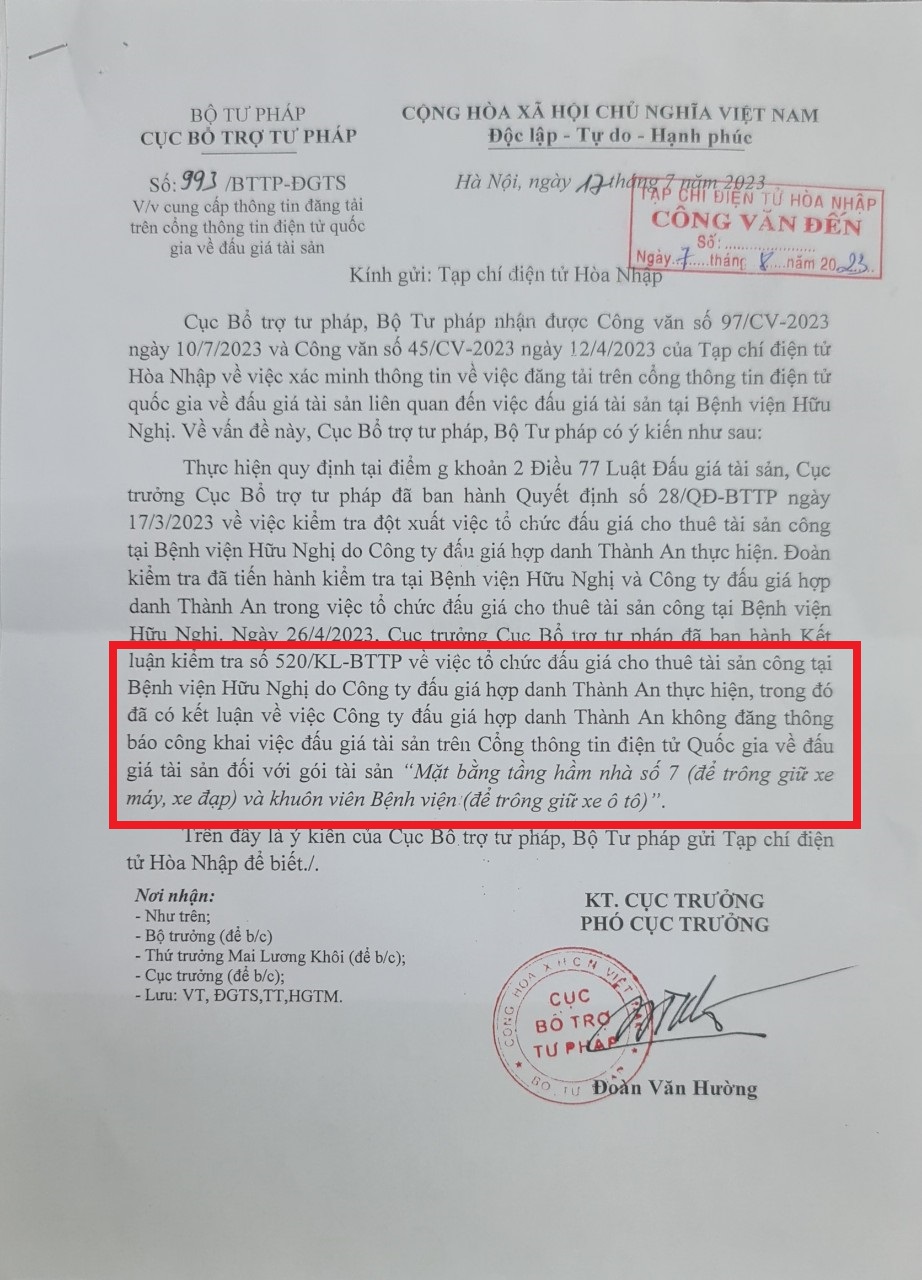 Ngày 17/7/2023, Cục Bổ trợ tư pháp ban hành văn bản số 993/BTTP-ĐGTS gửi Tạp chí điện tử Hòa Nhập. Theo nội dung văn bản, ngày 26/4/2023, Cục trưởng Cục Bổ trợ tư pháp đã ban hành kết luận kiểm tra số 520/KL-BTTP về việc đấu giá tài sản công tại Bệnh viện Hữu Nghị do Công ty đấu giá Hợp danh Thành An thực hiện, trong đó đã có kết luận về việc Công ty đấu giá Hợp danh Thành An không đăng thông báo công khai việc đấu giá tài sản trên Cổng thông tin điện tử Quốc gia về đấu giá tài sản đối với gói tài sản “Mặt bằng tầng hầm nhà số 7 (để trông giữ xe máy, xe đạp) và khuôn viên Bệnh viện (để trông giữ ô tô)”.