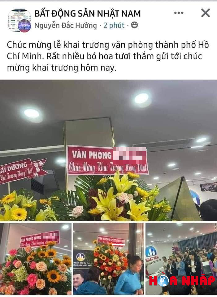 Cụ thể, rất nhiều hình ảnh nhạy cảm tại buổi khai trương VP của Công ty Nhật Nam tại TP. Hồ Chí Minh, kèm những lẵng hoa cùng dòng chữ chúc mừng của các cơ quan Trung ương đã được Nhật Nam công bố nhằm đánh bóng tên tuổi. Điều đáng nghi ngại là những lẵng hoa này liệu có phải của các cơ quan Trung ương tặng, hay Công ty Nhật Nam tự ý in băng rôn rồi treo kèm vào để đánh lừa nhà đầu tư, đánh bóng tên tuổi ? để thuận đường cho việc gọi vốn ? câu hỏi này rất cần được các cơ quan công an vào cuộc điều tra làm rõ.