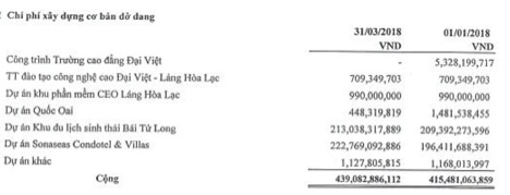 Trong BCTC quý 1/2018, các số liệu tài chính đầu tư cho chi phí xây dựng dở dang cũng đã thể hiện rõ ưu tiên đầu tư cho hai dự án Condotel của CEO. Theo đó, CEO đã dành tổng 439 tỷ để chi phí cho xây dựng dở dang, trong đó hai dự án condotel tại Bái Tử Long và Phú Quốc là hơn 435 tỷ, chỉ giành 4 tỷ cho các dự án khác.