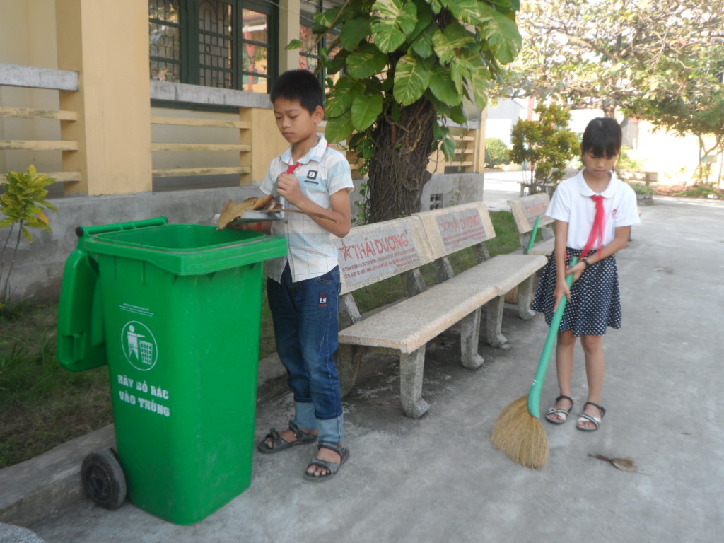 | Học sinh Trường Tiểu học Trực Thuận quét dọn vệ sinh, bỏ rác vào thùng rác cơ động. |