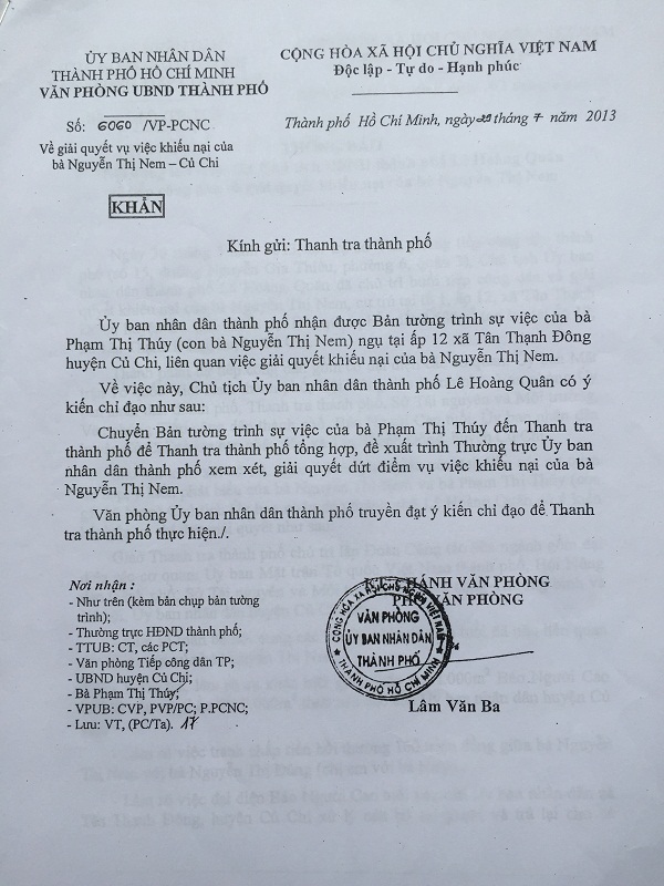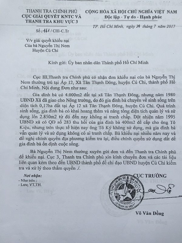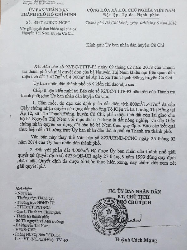 Trước đó, ngày 24/7/2017, Cục giải quyết KNTC và thanh tra khu vực III (Cục III)- Thanh tra Chính phủ, có văn bản số 161/CIII-C.Tr gửi UBND TP.HCM, đơn KN của bà Nguyễn Thị Nem, để chỉ đạo UBND Củ Chi kiểm tra và xử lý theo thẩm quyền. Mặc dù còn 1 số nội dung chưa được Thanh tra thành phố kiểm tra, xác minh thu thập chứng cứ làm rõ theo chỉ đạo của Chủ tịch UBND thành phố nhưng Thanh tra thành phố vẫn đề xuất UBND thành phố, ban hành Công văn số 1879/UBND-PCNC ngày 4/6/2018, do Phó Chủ tịch Huỳnh Cách Mạng ký, giao UBND huyện Củ Chi cắm mốc, đo đạc xác định phần đất diện tích 800m2/1.417m2 đã cấp Giấy chứng nhận quyền sử dụng đất cho ông Tô Kiệu, bà Lương Thị Hồng tại ấp 12, xã Tân Thạnh Đông, huyện Củ Chi; phần diện tích đất còn lại giao cho hộ bà Nem với mục đích sử dụng là đất nông nghiệp và cấp giấy chứng nhận QSDĐ cho hộ bà Nem theo quy định. Sau khi có Công văn này, UBND huyện Củ Chi không đo đạc, cắm mốc ngăn chia rah giới, trong khi ông Nguyễn Văn Máy (đại diện ông Tô Kiệu) liên tục đến buộc gia đình bà Thúy phải giao đất, ông Máy còn đánh ni sư Phạm Thị Huệ (chị bà Thúy), gây thương tích nhưng đến nay vụ cố ý gây thương tích vẫn chưa được xử lý. Mới đây, ngày 8/7/2019, UBND huyện Củ Chi có Thông báo số 7907/TB-UBND yêu cầu gia đình bà Thúy phải tháo dỡ căn nhà tạm, hiện là quán cà phê và căn chòi làm tiệm uốn tóc- là nguồn thu chính của gia đình, gây bức xúc trong dư luận.