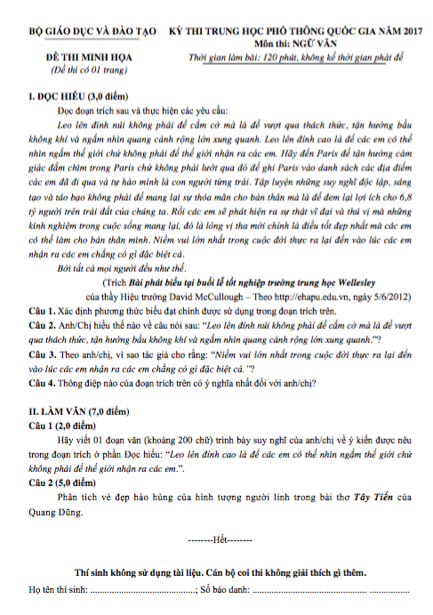 HOANHAP.VN - Chiều 5/10, Bộ Giáo dục và Đào tạo công bố đề thi minh họa môn Văn 2017.