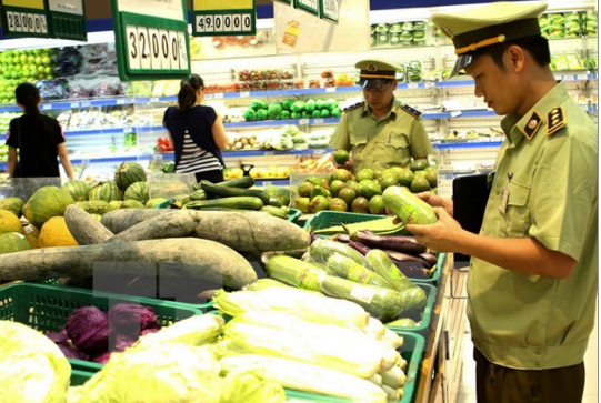| Lực lượng quản lý thị trường kiểm tra chất lượng thực phẩm tại siêu thị. (Ảnh: Vũ Sinh/TTXVN) |