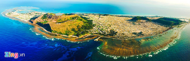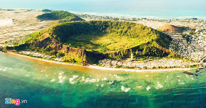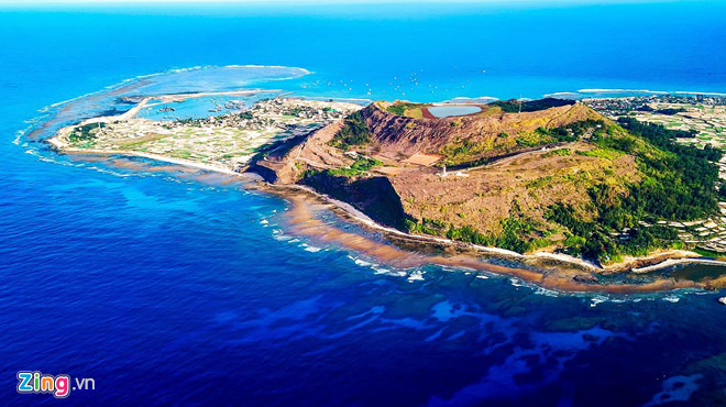 Toàn cảnh miệng núi lửa Thới Lới và Giếng Tiền có niên đại hàng triệu năm ở huyện đảo Lý Sơn. Ảnh: Minh Hoàng.