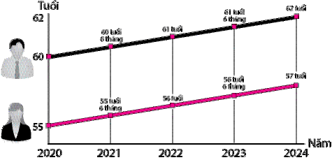Tại dự thảo, Bộ LĐ-TB&XH vẫn đưa ra 2 phương án tăng tuổi nghỉ hưu. Theo đó, phương án 1 là giữ nguyên tuổi nghỉ hưu như hiện hành, theo đó, nam đủ 60 tuổi, nữ đủ 55 tuổi. Phương án 2 là tăng tuổi nghỉ hưu của nam lên 62 và nữ lên 60 tuổi, tức tăng lần lượt 2 tuổi và 5 tuổi so với hiện nay.