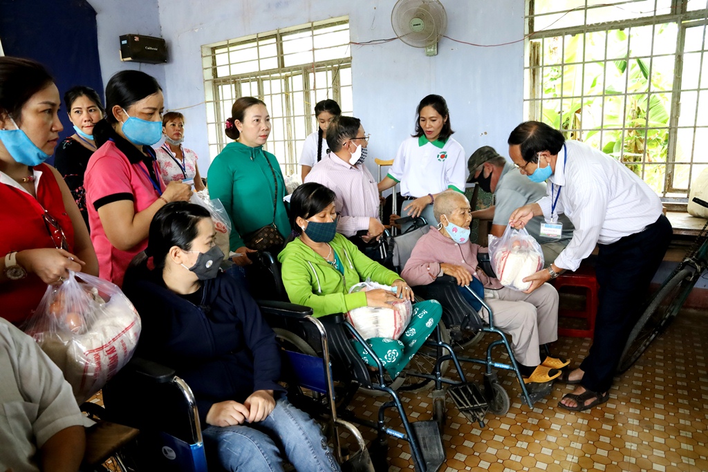 Bác sĩ Trương Tấn Minh trao quà cho người khuyết tật huyện Diên Khánh Khánh.