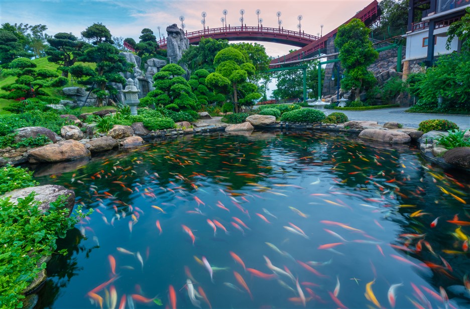 Chờ đợi ở phía bên kia của hành trình với cáp treo Nữ hoàng là một “xứ Phù Tang thu nhỏ”. Những dáng hắc tùng uốn thế bon sai đầy ấn tượng trên nền cỏ xanh mướt mát. Hồ cá Koi sặc sỡ đủ màu với cây cầu nhỏ bắc ngang dòng nước trong veo. Cầu Koi đỏ rực nổi bật trên nền xanh của vườn Nhật, những đèn đá trong khu vườn rải đầy sỏi, những lối đi rải sọi lạo xạo bước chân. Đừng nói chỉ người có tuổi mới mê mẩn không gian đậm chất zen Nhật Bản ấy, du khách trẻ tới đây thậm chí chẳng muốn rời.