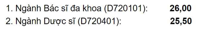 Điểm trúng tuyển dự kiến cao nhất của hệ dân sự, Học viện Quân y là 26 điểm với ngành Bác sĩ đa khoa. Ngành Dược sĩ có điểm trúng tuyển dự kiến 25,5.