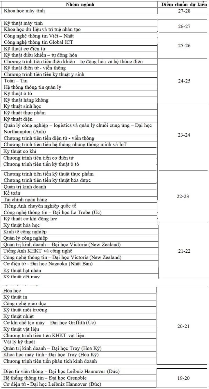 Các nhóm ngành kỹ thuật cơ điện tử, kỹ thuật điều khiển tự động hóa, công nghệ thông tin Việt-Nhật, công nghệ thông tin Global ICT có điểm chuẩn dự kiến từ 25 đến 26 điểm. Nhóm ngành còn lại có điểm chuẩn dự kiến thấp nhất từ 19 đến 20 điểm...