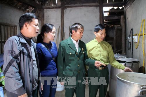 | Thành viên HTX đi tham quan dây chuyền sản xuất bỏng ngô của anh Nguyễn Ánh Đăng tại tiểu khu 19, thị trấn Hát Lót, huyện Mai Sơn (Sơn La). |