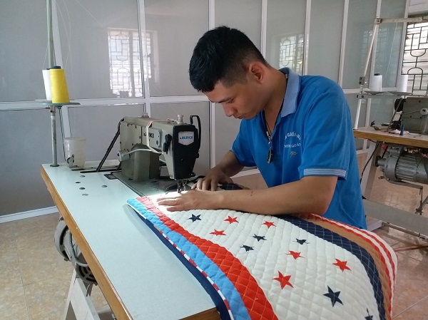 Dẫn tôi đến thăm cơ sở này, chị bạn gợi ý: “Vợ chồng anh Quân - chị Minh giỏi lắm. Chồng khuyết tật nhưng lấy được cô vợ rất xinh, đảm đang, tháo vát, khéo léo trong kinh doanh. Anh chị có 2 cháu, 1 trai, 1 gái rất kháu khỉnh”. Chị Minh đang đi kiểm tra cơ sở mới khai trương. Anh Quân đanh hoàn thiện sản phẩm gối và đệm để kịp giao cho nhà xe giường nằm Hùng Cúc. Anh Quân chào khách bằng nụ cười hiền lành, rồi lại chăm chú với công việc đang làm. Một lát sau, chị Minh có mặt tại cửa hàng với nụ cười… mát rượi.