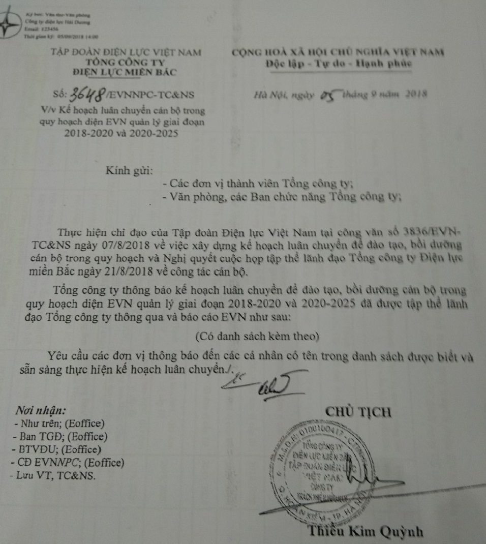 Tuy nhiên, chỉ 15 ngày sau, Tổng Công ty Điện lực miền Bắc lại ra ngay văn bản số 3930/EVNNPC-TC&NS do ông Thiều Kim Quỳnh ký, với nội dung: Xét báo cáo của Cty TNHH MTV Điện lực Hải Dương tại văn bản số 2666/PCHD-TC&NS ngày 14/9/2018 về việc lùi thời điểm luân chuyển để đào tạo bồi dưỡng cán bộ đối với ông Phạm Trung Nghĩa do điều kiện hoàn cảnh gia đình (theo đơn đề nghị của ông Nghĩa ngày 06/9/2018). Trong văn bản ghi “Theo đề nghị của cá nhân ông Phạm Trung Nghĩa, hoàn cảnh gia đình rất khó khăn phải chăm sóc bố đẻ, vợ thường xuyên đau ốm, con nhỏ, bố, mẹ vợ sức khỏe không được tốt nên tập thể lãnh đạo thống nhất lùi kế hoạch luân chuyển đối với ông Phạm Trung Nghĩa sang năm 2019 trong kế hoạch chung của Tổng Công ty đến 2020 để tạo điều kiện cho ông Nghĩa sắp xếp, bố trí công việc gia đình, tham gia công tác điều hành của đơn vị được thuận lợi.”(?)