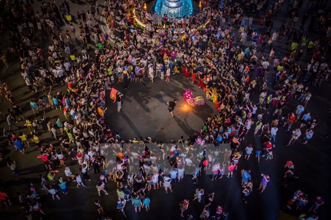 | Trình diễn múa lân trên quảng trường Đông Kinh Nghĩa Thục. (Ảnh: Trọng Đạt/TTXVN) |