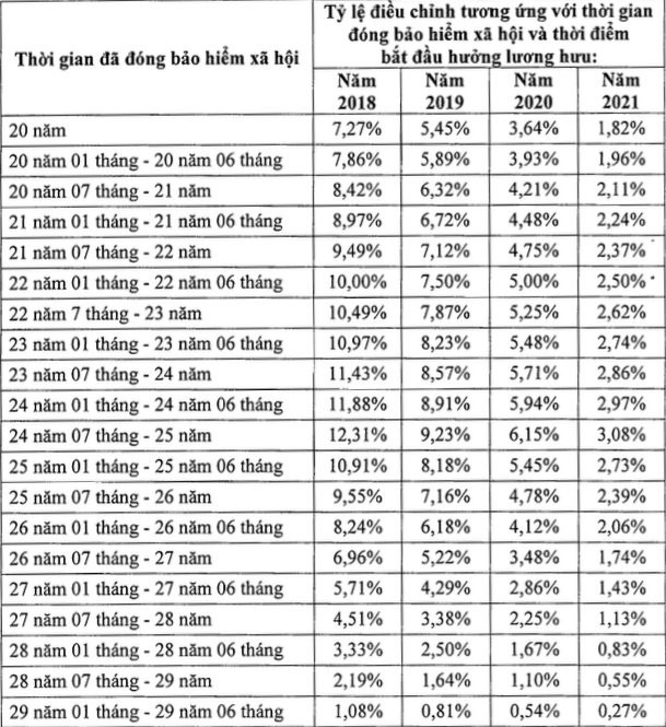 Theo đó, lao động nữ bắt đầu hưởng lương hưu từ ngày 1.1.2018 đến ngày 31.12.2021 mà có từ đủ 20 năm đến 29 năm 6 tháng tùy thuộc vào thời gian đã đóng bảo hiểm xã hội và thời điểm bắt đầu hưởng lương hưu, mức lương hưu được điều chỉnh bằng mức lương hưu tính theo quy định tại khoản 2 Điều 56 hoặc khoản 2 Điều 74 Luật bảo hiểm xã hội năm 2014 cộng với mức điều chỉnh.