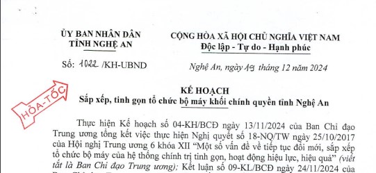 Ngày 19/12/2024, UBND tỉnh Nghệ An ban hành Kế hoạch 1022, yêu cầu tạm dừng việc luân chuyển và bổ nhiệm cán bộ trong tất cả các cơ quan, đơn vị từ thời điểm này cho đến khi hoàn thành việc sắp xếp và tinh gọn tổ chức bộ máy. Đây là một chủ trương quan trọng nhằm nâng cao hiệu quả hoạt động của các cơ quan nhà nước, đúng theo tinh thần Nghị quyết số 18-NQ/TW của Trung ương. Theo đó, sẽ sắp xếp, tinh gọn tổ chức các cơ quan chuyên môn thuộc UBND cấp tỉnh, huyện, thành phố thị xã thống nhất với sắp xếp, tinh gọn của tổ chức bộ máy của Chính phủ, đảm bảo tính đồng bộ, thống nhất và liên thông trong quản lý nhà nước với ngành, lĩnh vực từ Trung ương đến cấp huyện; đồng thời thực hiện sắp xếp tinh giảm đầu mối bên trong gắn với giảm biên chế, cơ cấu lại và nâng cao chất lượng đội ngũ công chức, viên chức, có số lượng cơ cấu hợp lý, có phẩm chất, năng lực, đáp ứng yêu cầu nhiệm vụ của từng cơ quan, tổ chức, đơn vị trọng thời kỳ mới. Đây là Kế hoạch được các cấp quản lý đánh giá là kịp thời và sát với yêu cầu tại Công văn số 22-CV/BCĐ ngày 05/12/2024 của Ban Chỉ đạo Trung ương về tổng kết việc thực hiện Nghị quyết số 18-NQ/TW; Kế hoạch số 141/KH-BCĐTKNQ18 ngày 06/12/2024 của Ban Chỉ đạo của Chính phủ về kế hoạch định hướng sắp xếp, tinh gọn tổ chức bộ máy của Chính phủ và công văn số 24/CV-BCĐTKNQ18 của Ban chỉ đạo của Chính phủ.
