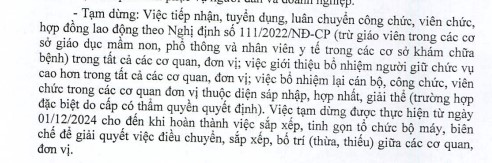 Cũng theo VB 1022/KH-BND của UBND tỉnh Nghệ An thì UBND yêu cầu dừng việc tiếp nhận, tuyển dụng và luân chuyển công chức, viên chức trong tất cả các cơ quan, đơn vị; việc bổ nhiệm lại cán bộ, công chức, viên chức trong các cơn quan đơn vị thuộc diện sát nhập, hợp nhất, giải thể. Việc tạm dừng này được thực hiện từ ngày 01/12/2024 cho đến khi hoàn thành việc sắp xếp, tinh gọn tổ chức bộ máy, biên chế để giải quyết việc điều chuyển, sắp xếp, bố trí (thừa,thiếu) giữa các cơ quan, đơn vị.