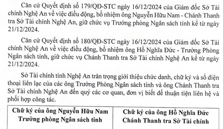 Mặc dù vậy, ngày 23/12/2024, Sở Tài chính Nghệ An đã ra văn bản thông báo giới thiệu chức danh và chữ ký của hai lãnh đạo cấp phòng mới, cụ thể: