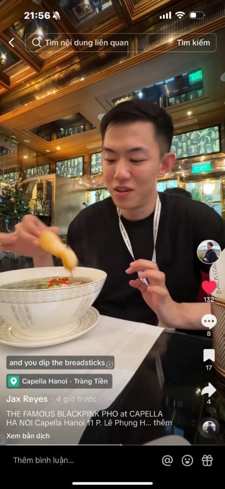 Mặc dù lịch trình di chuyển gấp gáp, đoàn khách vẫn dành thời gian để thưởng thức món phở bò truyền thống tại khách sạn 5 sao Capella ngay trung tâm Thủ đô Hà Nội. Chia sẻ video phấn khích khi thưởng thức phở Việt, tài khoản Tiktoker Beatrice Asia nhận về hơn 24.000 lượt thả tim cùng nhiều bình luận “wow” đầy thích thú, mong muốn được một lần thử cảm giác ăn phở trong khách sạn nổi tiếng từng hai năm liên tiếp được vinh danh là Khách sạn Boutique sang trọng hàng đầu Châu Á.