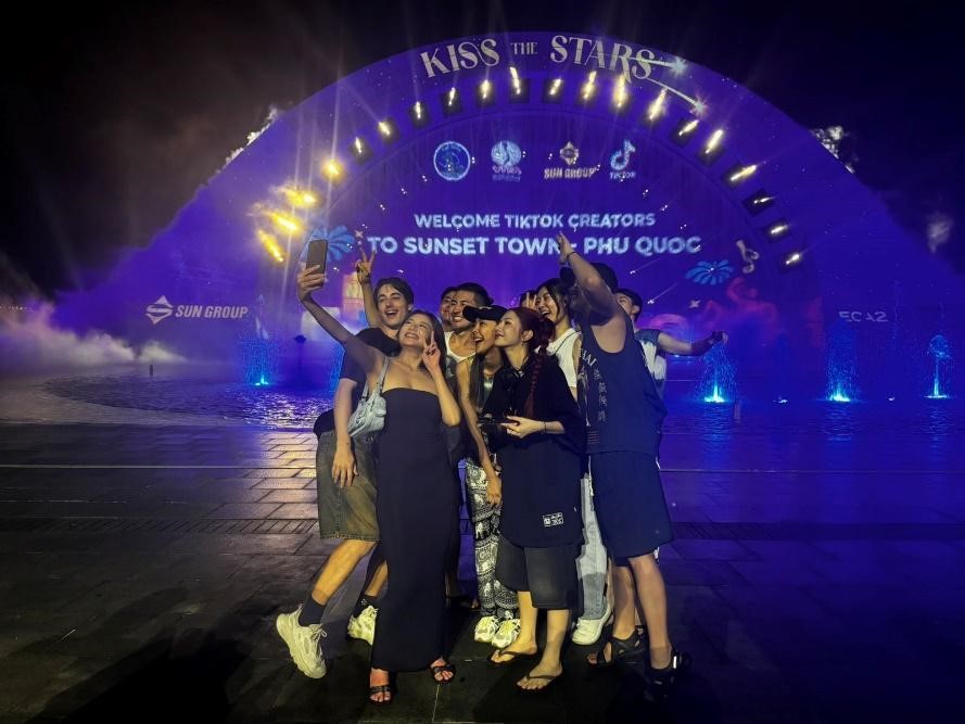 Tới thăm Thị trấn Hoàng Hôn đúng thời khắc mặt trời xuống biển, đoàn TikTok Creators quốc tế đã tận mắt chiêm ngưỡng khung cảnh hoàng hôn ngoạn mục buông xuống Cầu Hôn, công trình lấy cảm hứng từ bức tranh Chúa tạo ra Adam (The Creation of Adam) của danh họa Michelangelo và từ cây cầu Ô Thước kết mối lương duyên Ông Ngâu - Bà Ngâu trong truyền thuyết Việt Nam.
