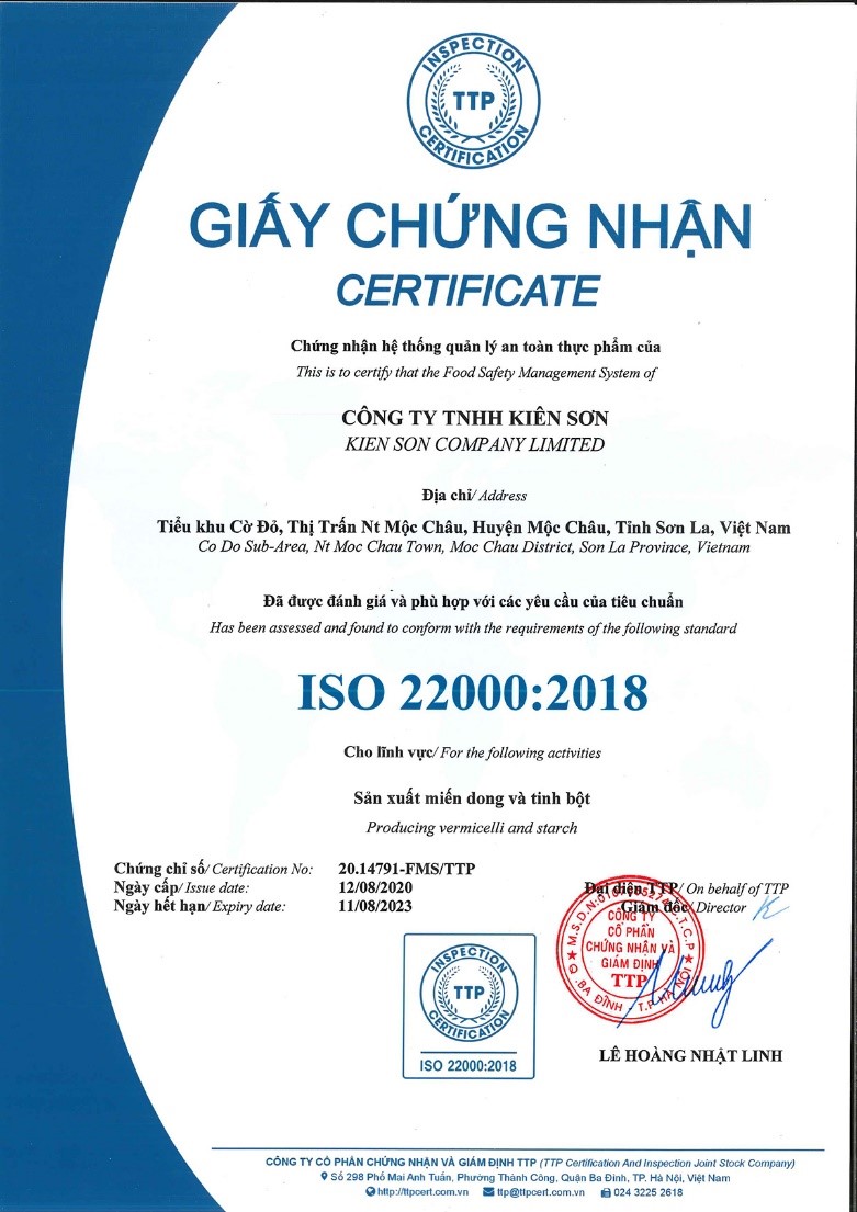 Miến dong Kiên Sơn đạt tiêu chuẩn ISO 22000: 2018 cấp quốc gia