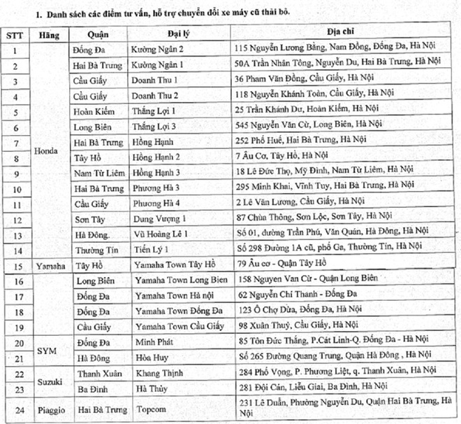 Danh sách các điểm hỗ trợ chuyển đổi xe máy cũ
