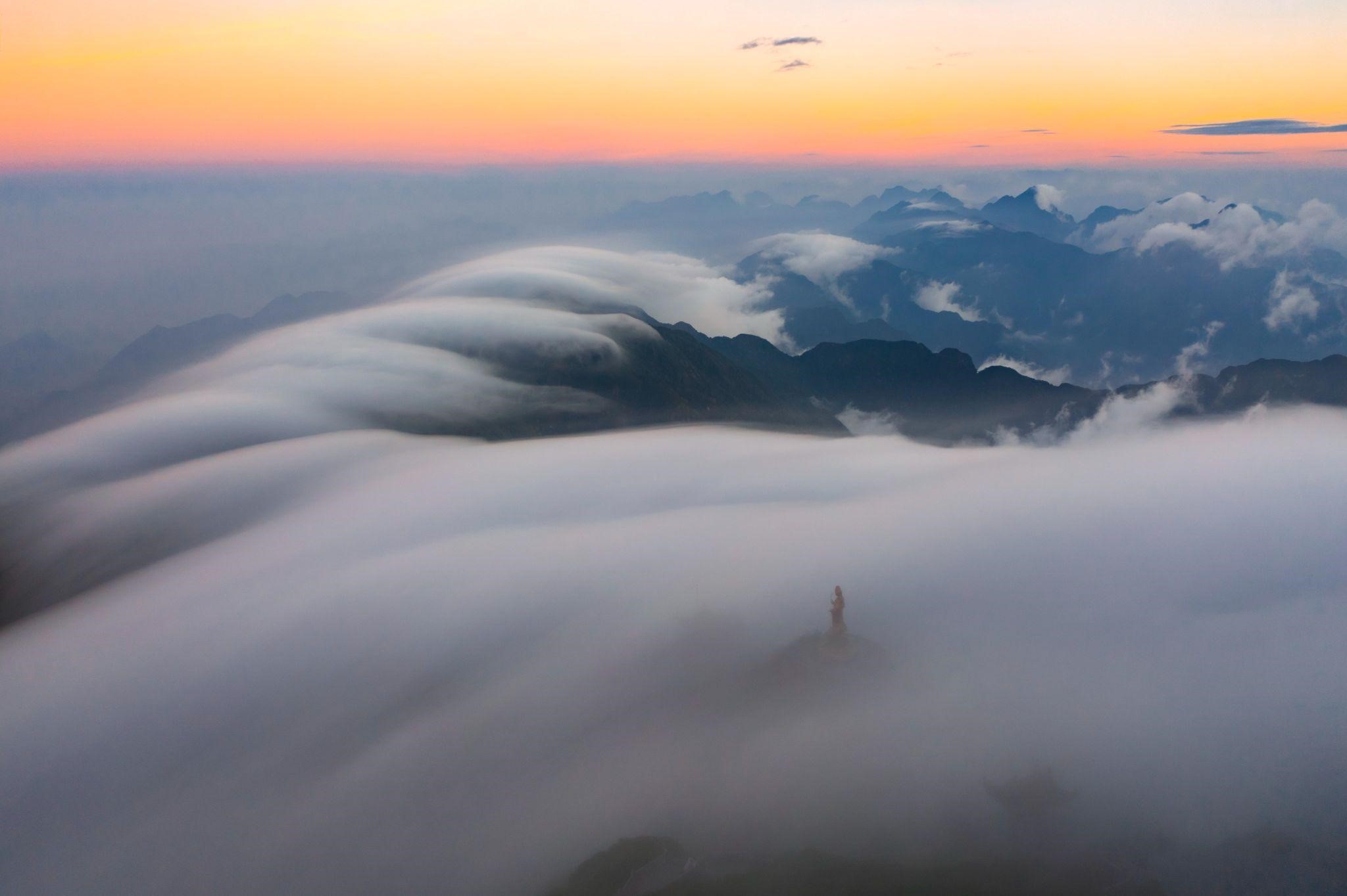 Tác giả Vũ Ngọc Tuấn lựa chọn tác phẩm “Bình minh trên Nóc nhà Đông Dương” là một trong những bài dự thi năm nay của mình. Trong ảnh, tượng Phật bà Quán thế âm hiện lên từ bi, giữa khung cảnh huyền ảo tựa tranh vẽ của núi rừng Hoàng Liên Sơn. Ảnh: Vũ Ngọc Tuấn