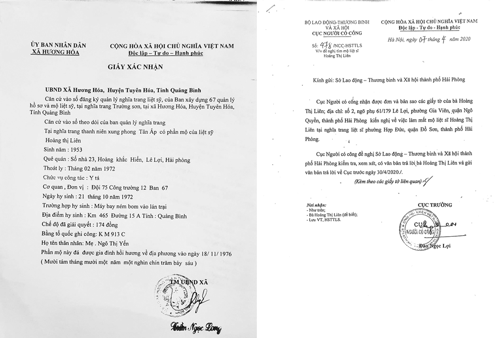 Gần đây nhất, Cục Người có công – Bộ LĐTB&XH đã có công văn số 478/NCC-HSTTLS ngày 07/04/2020, đề nghị Sở LĐTB&XH Hải Phòng tiếp tục chỉ đạo kiểm tra, xem xét và giải quyết đơn thư và trả lời gia đình liệt sỹ Hoàng Thị Liên