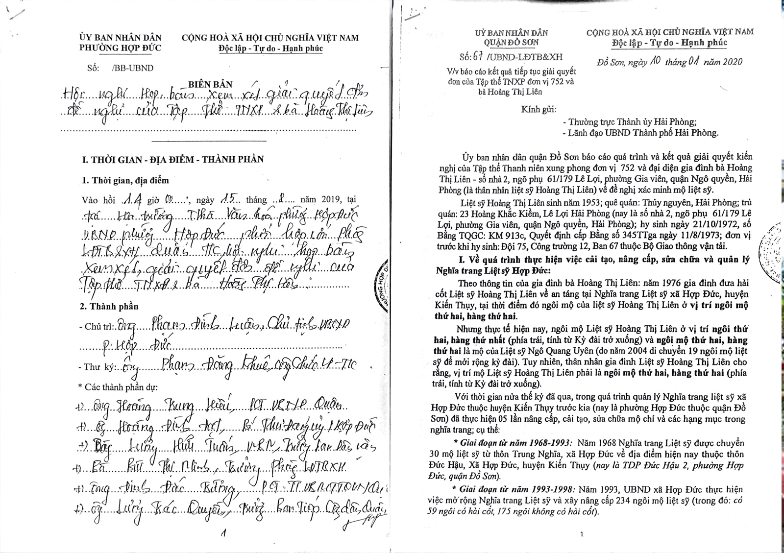 Biên bản làm việc UBND phường Hợp Đức để giải quyết đơn kiến nghị của tập thể TNXP và gia đình Liệt sỹ Hoàng Thị Liên; Báo cáo số 67/UBND-LĐTB&XH của UBND quận Đồ Sơn.