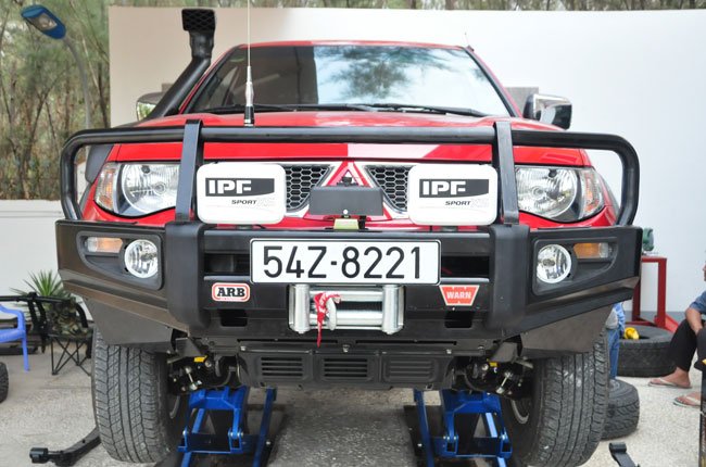 Đầu tiên chiếc xe thường được lắp thêm cản trước và cản sau, hiện trên thị trường có 3 loại cản với mức giá từ 2 - 30 triệu 1 bộ, tác dụng của cản xe là chống va chạm nhẹ vào xe, là nơi lắp đèn, tời, móc kéo, giá để xe đạp phía sau… chính hãng ARB có nhiều loại cản để lựa chọn, hình dáng khác nhau: đơn giản chữ U ngược (SAHARA) hoặc BULLBAR là cản hình thang gắn cả đèn và tời, đáp ứng hầu hết các loại SUV và bán tải.