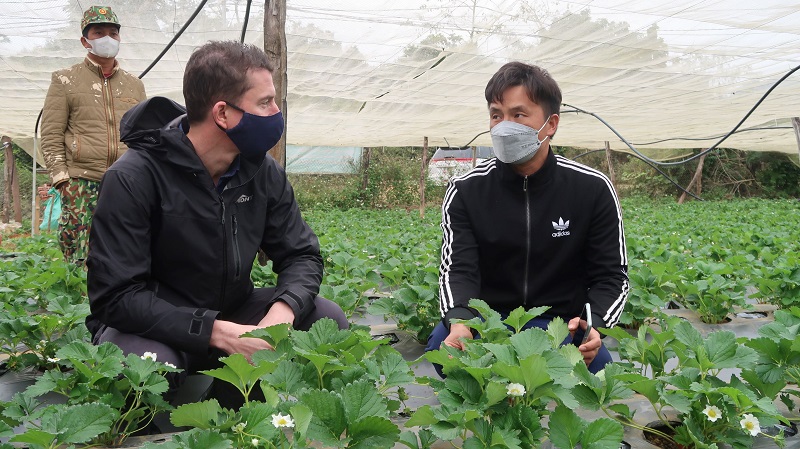 Phó Đại sứ Australia Mark Tattersall, Đại sứ quán Australia tại Việt Nam trò chuyện với anh Vi Văn Tùng tại trang trại dâu tây của anh ở Mộc Châu.