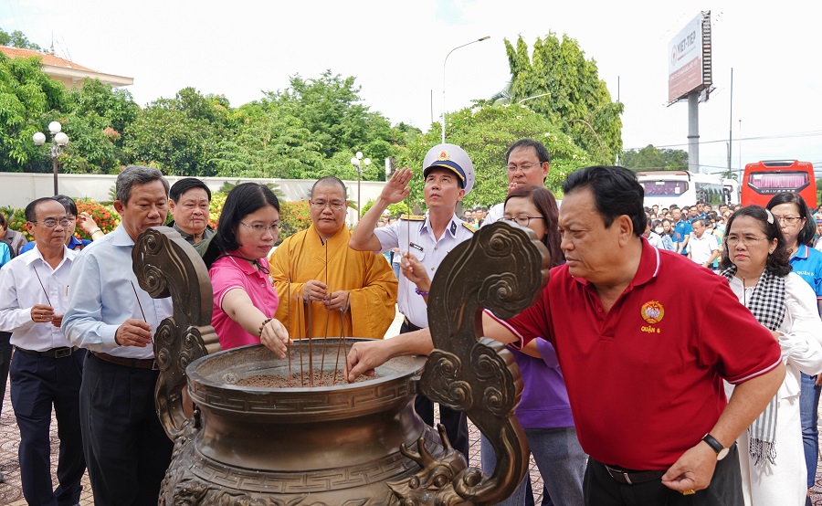 Trong sáng cùng ngày, 250 cán bộ của đoàn đại biểu MTTQVN TP Hồ Chí Minh đã thắp hương tại Đài tưởng niệm liệt sĩ Cỏ May (TP Vũng Tàu), nhân kỷ niệm 76 năm Ngày Thương binh Liệt sĩ (27/7/1947-27/7/2023).