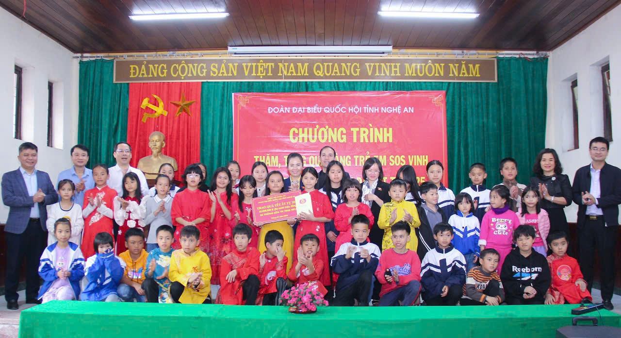 Đoàn đại biểu Quốc hội tỉnh Nghệ An đã đến thăm hỏi, động viên, tặng quà Tết cho các trẻ mồ côi ở Làng trẻ em SOS TP.Vinh, gồm 30 triệu tiền mặt và 30 thùng sữa tươi. Hơn 34 năm qua, Làng em SOS TP.Vinh đã chăm sóc và nuôi dưỡng gần 1.000 trẻ mồ côi, có hoàn cảnh đặc biệt khó khăn.