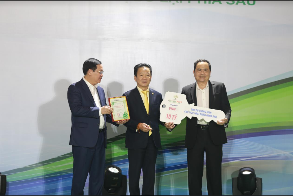 Doanh nhân Đỗ Quang Hiển (ở giữa) trao ủng hộ, đồng hành cùng chương trình “Cả nước chung tay vì người nghèo” năm 2019.