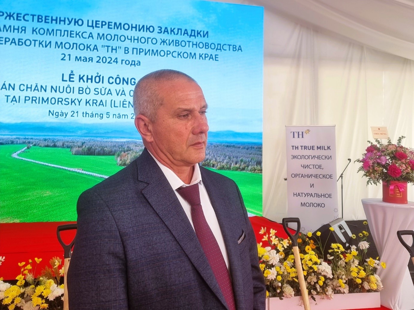 Ông Korenchuk Alexey Alexandrovich - Quận trưởng quận Yakovlevsky đại diện chính quyền địa phương trao đổi với báo giới tại Lễ khởi công dự án Chăn nuôi bò sữa và Chế biến sữa của Tập đoàn TH