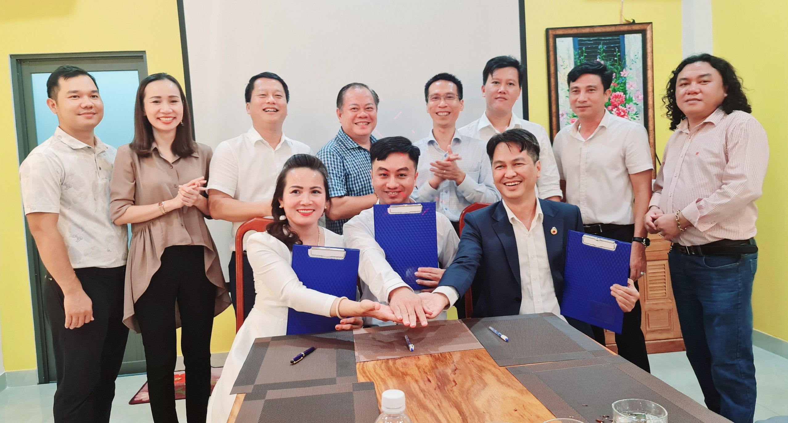 Phó Chủ tịch YBA HCM Lê Anh Tú (bìa phải), Giám đốc TT XTĐT,TM&DL tỉnh Trần Quốc Duy (chính giữa), Phó Chủ tịch YBA Bình Phước Hoàng Thị Thanh Vân (bìa trái) cùng ký kết biên bản hợp tác.