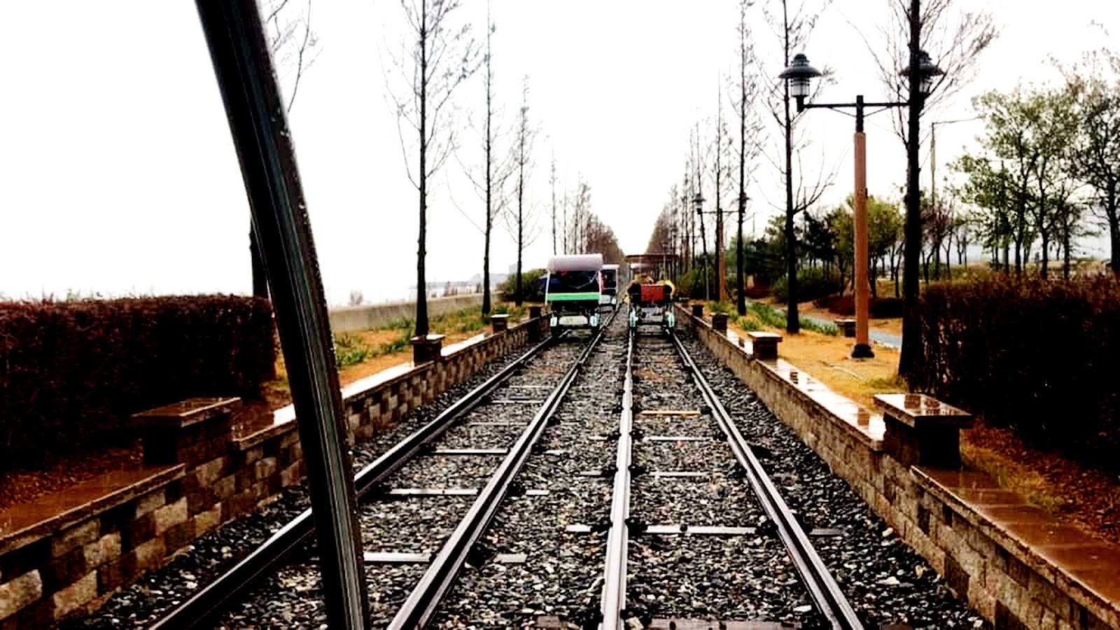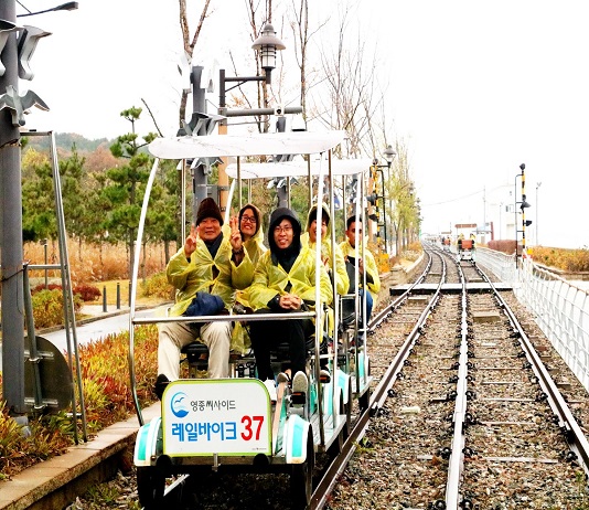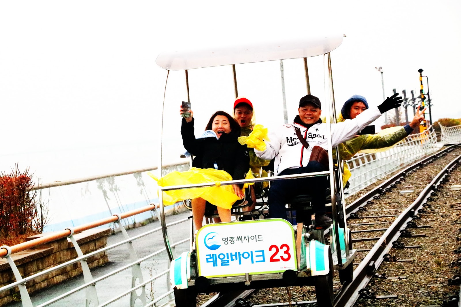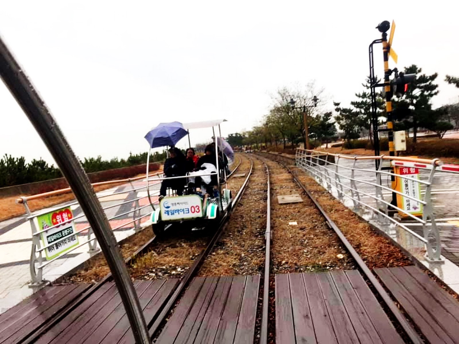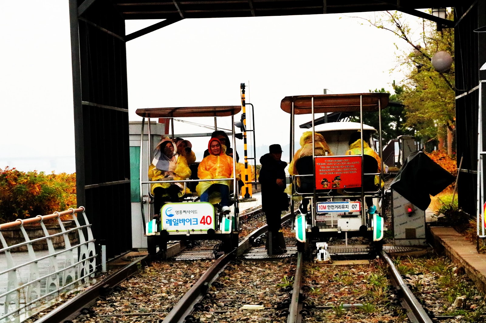 Được biết, Hàn Quốc đã có nhiều điểm đạp xe trên đường ray nhưng đây là nơi đầu tiên ở Incheon và sở hữu cung đường đẹp, lãng mạng ngay cả khi đang đi dưới mưa. Hôm chúng tôi đi khá vắng khách, chỉ có đoàn chúng tôi gồm 20 người với 5 chiếc xe. Lần lượt từng 4 người lên một chiếc xe, khởi hành cách nhau một phút bởi vì nếu đi cùng nhau sẽ gây va chạm. Cẩn thận là thế, nhưng xe trước chúng tôi là bốn cô gái bỗng dưng thắng bất ngờ và “rầm”, hai chiếc xe đụng vào nhau.