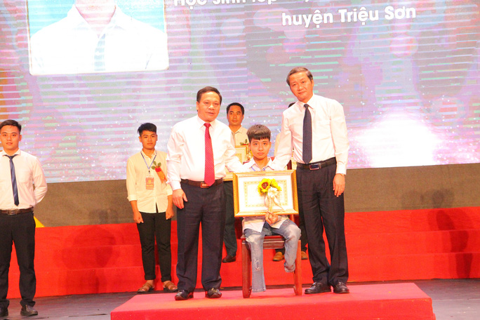 Ông Đỗ Minh Tuấn, Phó bí thư Tỉnh ủy Thanh Hóa, và ông Phạm Thanh Sơn, Phó chủ tịch Thường trực HĐND tỉnh Thanh Hóa, tặng hoa, bằng khen tôn vinh em Nguyễn Tất Minh (Ảnh Báo NLĐ)