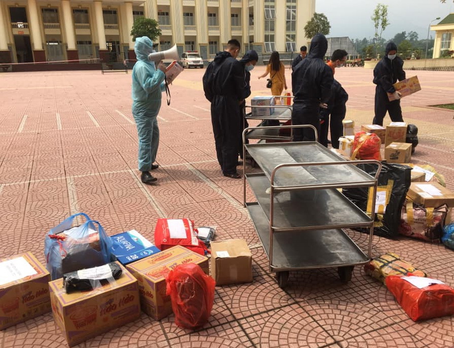 Để đảm bảo cơm ba bữa sáng, trưa, chiều theo từng suất ăn cho gần nghìn khách đang ở trong hai nhà xây cao 5 tầng đều do chiến sĩ trẻ bê bộ những túi hộp cơm đó từ hàng rào cách ly đến giao từng phòng cho khách. Đấy là chưa nói đến có rất nhiều nhiều bình nước lọc 20 lít nặng chính chịch cũng bám chặt vào cánh tay người lính để leo lên hết các tầng nhà. Song, việc khuân vác bộ của các anh vẫn không dừng lại đó. Bởi một lẽ, cứ đều đặn sáng, chiều của ngày, khách được nhận quà từ người thân ở bên ngoài gửi đến đủ các loại (trừ dao, kéo, rượu bia, thực phẩm tươi sống). Tất cả đều được các chiến sĩ vận chuyển bằng xe đẩy (từ bên ngoài cổng doanh trại đến khu cách ly khoảng 500m) vào. Các thùng hàng to nhỏ đó được tập kết sát ngay cổng hàng rào ngăn cách để các chiến sĩ vòng trong mang vào cho khách.