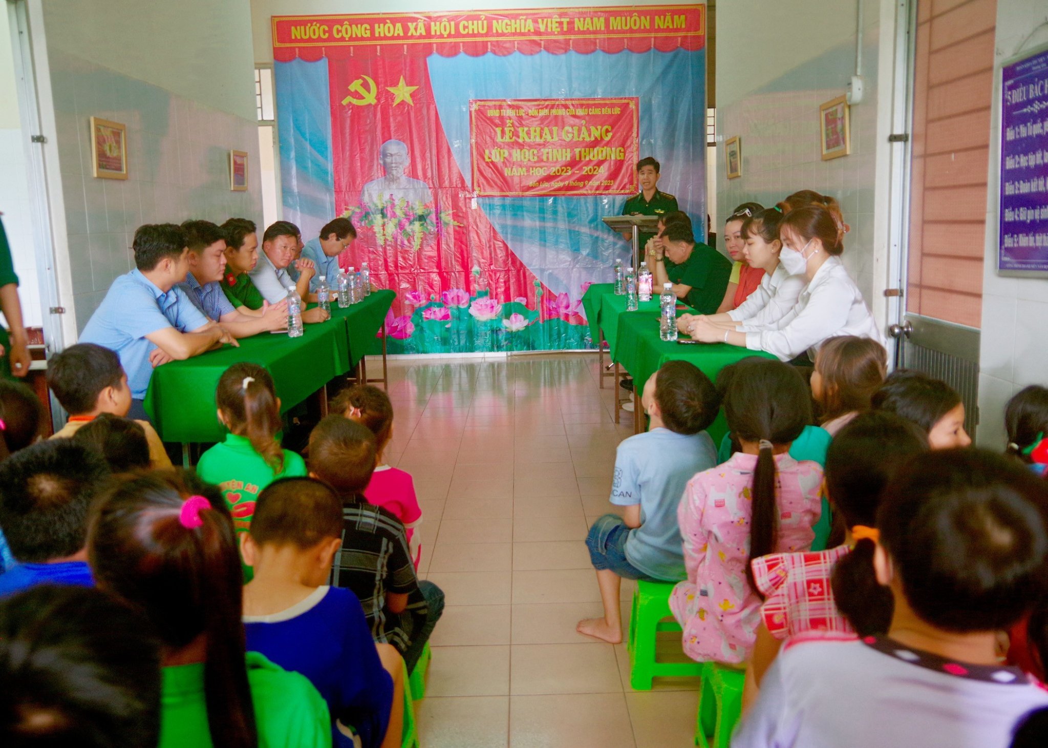 Tham dự buổi lễ có Thượng tá Vũ Minh Tùng – Chủ nhiệm Chính trị BĐBP tỉnh; Cấp ủy, Ban Chỉ huy Đồn Biên phòng CKC Bến Lức, đại diện Phòng Giáo dục và Đào tạo huyện Bến Lức; Đảng ủy, Ủy ban nhân dân, UBMTTQ Việt Nam thị trấn Bến Lức; đại diện các nhóm thiện nguyện, nhà hảo tâm, nhà tài trợ cùng các thầy, cô giáo và các em học sinh lớp học tình thương.
