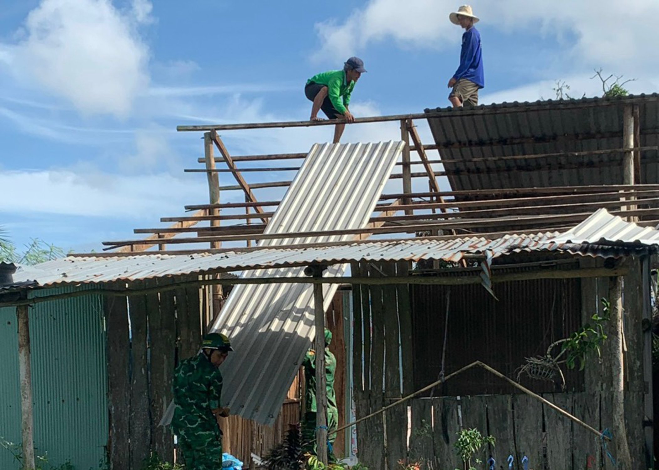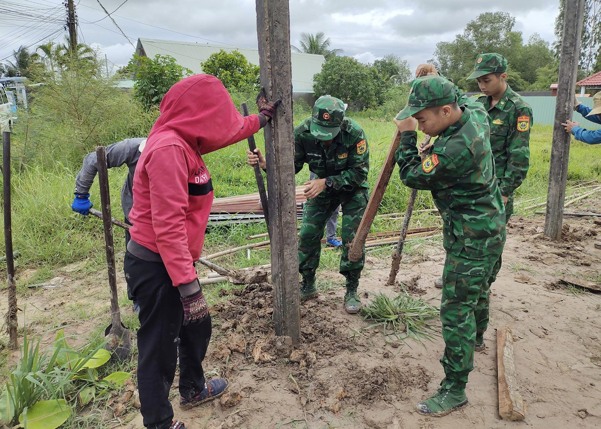 Cán bộ, chiến sĩ Đồn Biên phòng Bình Thạnh phối hợp tổ chức tháo dỡ nhà cũ, chuẩn bị xây dựng nhà Đại đoàn kết cho hộ gia đình anh Lê Hồng Thịnh