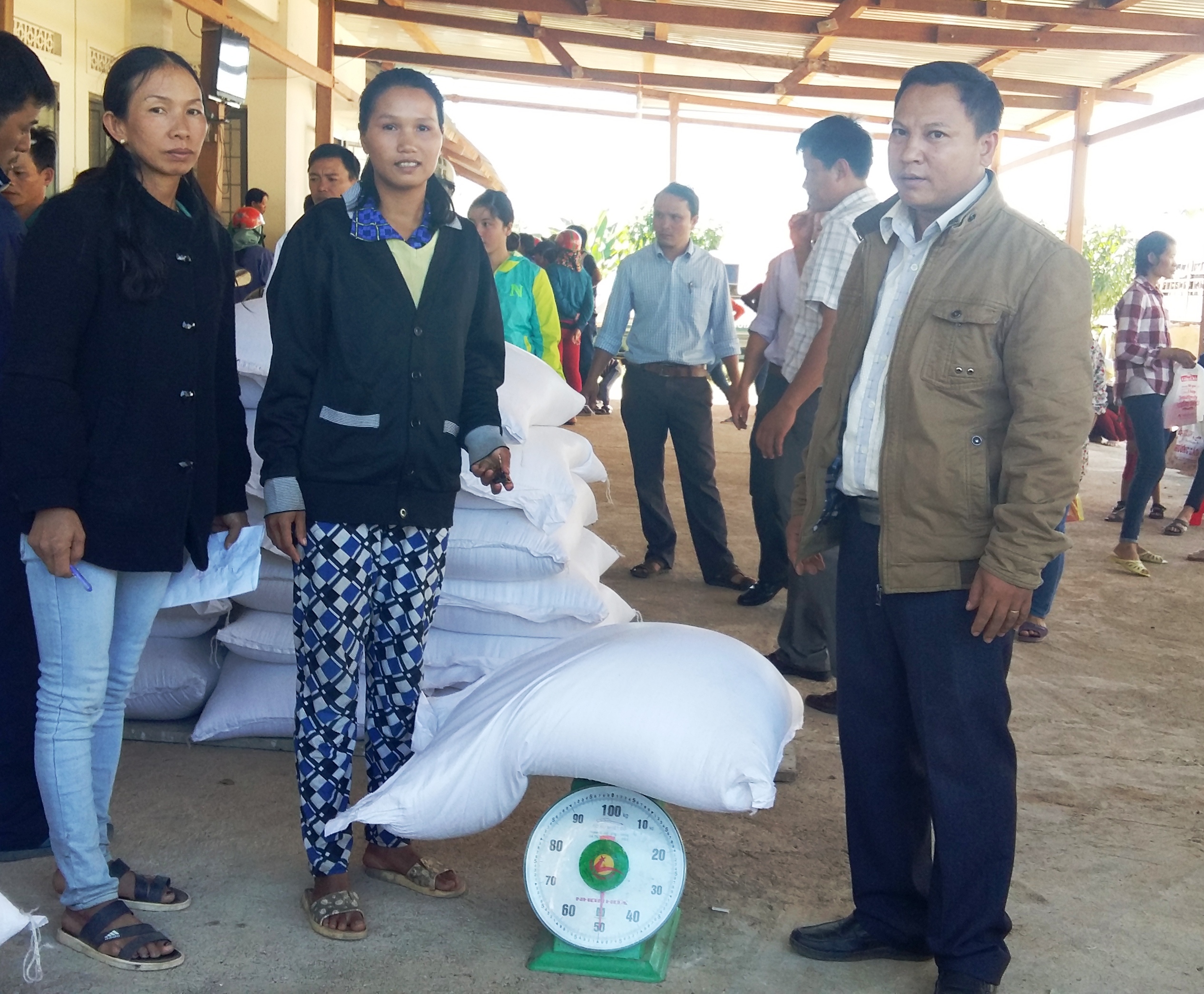 Vừa nói, chị H’Mui vừa cùng cán bộ xã bê gạo lên cân. Nhà chị H’Mui được hỗ trợ 75 kg gạo vì có 5 khẩu - 2 vợ chồng và 3 đứa con.